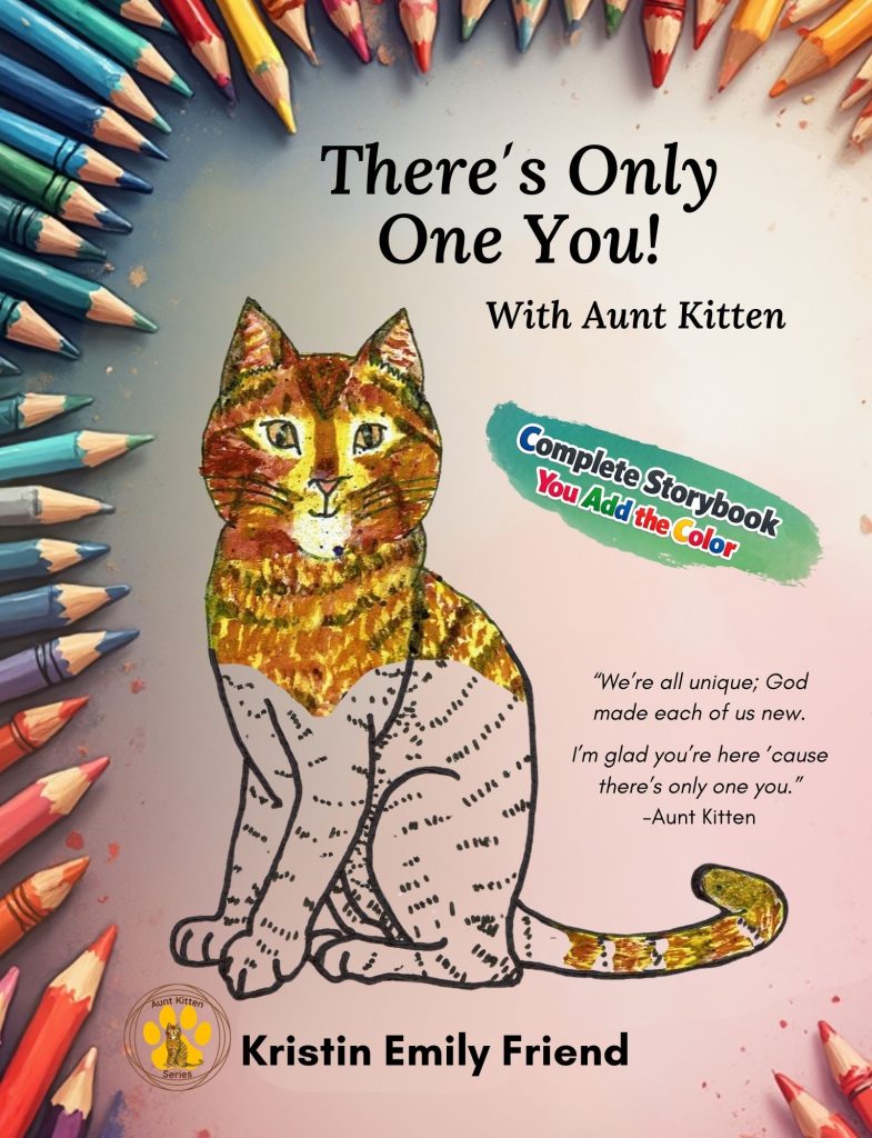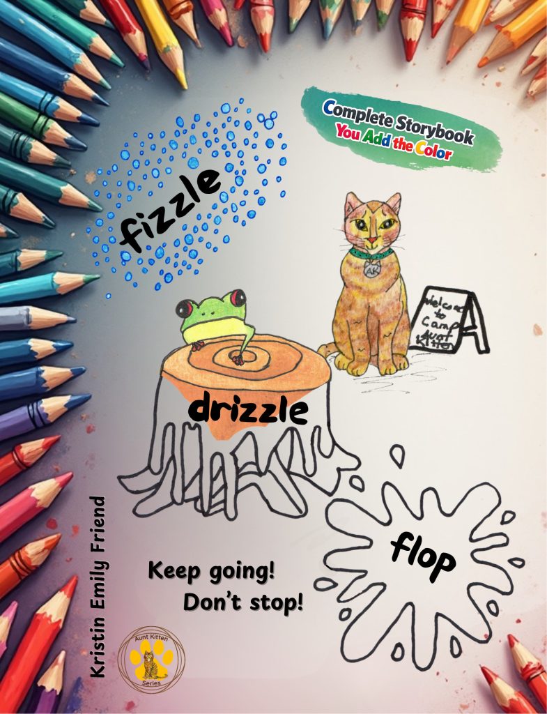 Coloring Book Versions Now Available! April 5, 2026April 5, 2026 Publishing News I am excited to let you know that the coloring book version of There’s Only One You! With Aunt Kitten and the coloring book version of Fizzle Drizzle Flop: Keep Going! Don’t Stop! are now available on Amazon! “Littles” in my life have enjoyed adding color to these books using crayons, colored pencils, markers, and watercolor paint. The texts are the same as their companion book. This means the coloring book versionsy are complete story books, not just pictures to color. The illustrations are similar to the original book; my watercolor illustrations have been outlined so you or your littles can add the color. Sample Pages Book Sizes and A Cover Update During this publishing process, I decided to update the cover of There’s Only One You! With Aunt Kitten. The new version is shown below. Another difference between the coloring book version and the orignial is the size. The coloring book versions are 8.5×11 inches rather than the original square 8.5×8.5. Ways to Purchase As always, you can purchase these books directly from Amazon or when you see me out and about and at vendor events. I typically carry a small supply in my car and I’m happy to sign them for you. My summer vendor schedule isn’t set yet, but I plan to be at the first Uniontown Farmers’ Market on May 30, 2026. I don’t know my additional dates at that weekly venue. I may also sell at the Farmers’ Market in Springs, PA, this summer. If you are like me, I prefer reading a picture book before purchasing a hard copy. Good news! The original versions of There’s Only One You and Fizzle Drizzle Flop are free to read on Kindle Unlimited. Thank you! Thank you to the many folks who have encouraged and cheered me on in this process. I cherish your enthusiasm as you saw and held the printed books for the first time. Happy reading … and coloring! Kristin aka Aunt Kitten 🐾 Purchase There’s Only One You Coloring Book Version from Amazon with this link. Purchase Fizzle Drizzle Flop Coloring Book Version from Amazon with this link. Aunt Kitten Books Coloring Book Versions Fizzle Drizzle Flop - Keep Going, Don't Stop! There's Only One You! Aunt Kitten BooksColoring BooksPicture Books