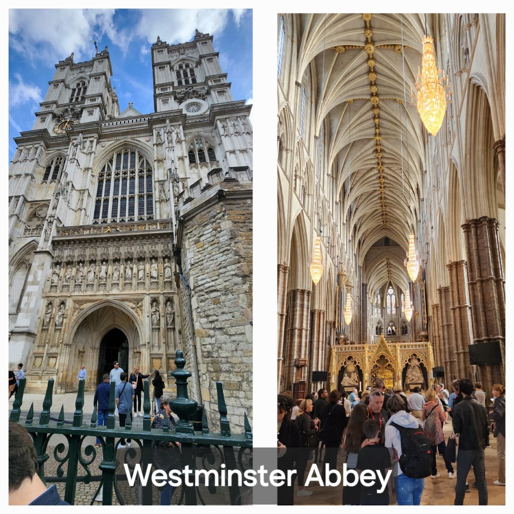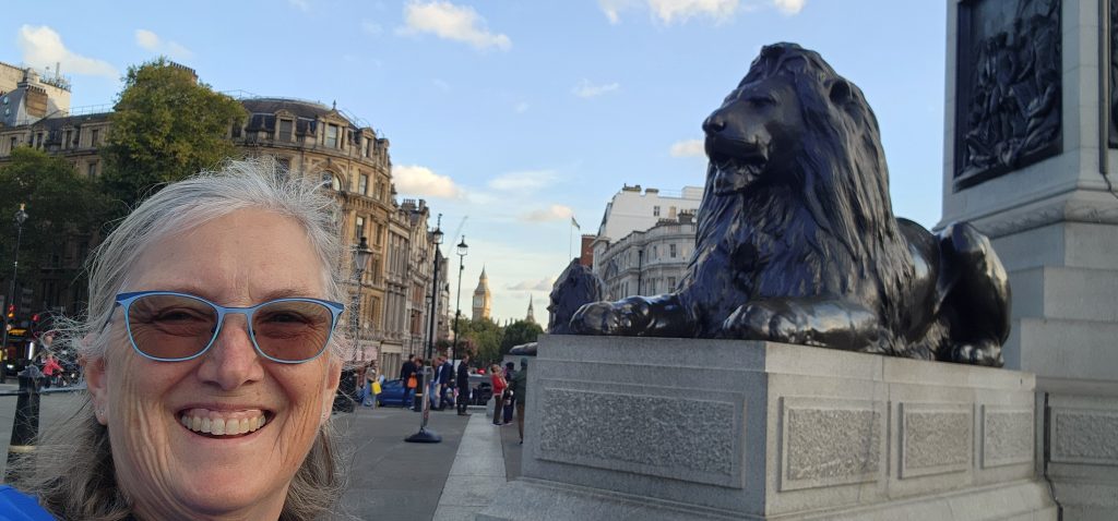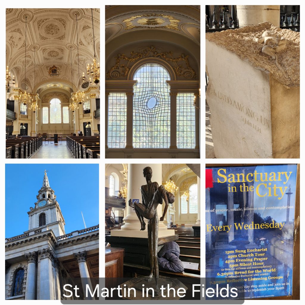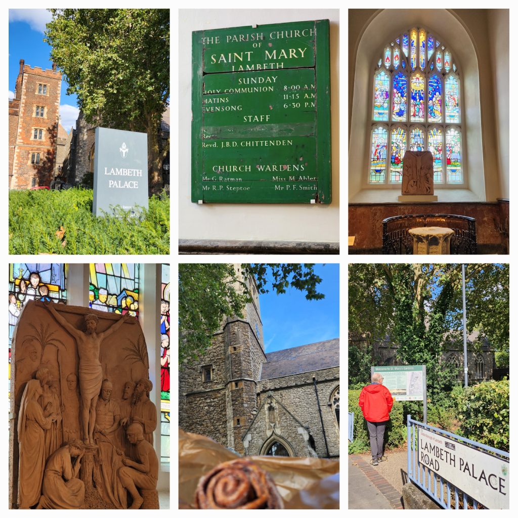 England/Scotland 2024 Pilgrimage – Day 17: London September 18, 2024December 18, 2024Tuesday, September 17, 2024Since we were both exhausted, we decided to sleep in until 8:00. Ten hours of sleep was much needed and refreshing. I worked on the blog a bit, then we were off to find breakfast.Fortitude BakehouseJennie texted several recommendations for eating. She raved about Fortitude Bakehouse so we couldn’t pass it up. Obviously, many others couldn’t, either, since there was a long line down the alleyway it was on. We each picked out two items, a presumably savory Morning Bun for both of us, a Cinnamon Sticky Bun for me and a Chocolate Sticky Bun for Gregg, thinking we had a sweet and a savory.Oops! The Morning Bun was sweet, too, although delicious! It had a cream center with raspberries in an egg based pastry. We were not disappointed, yet decided to keep the sticky buns for later. Oh, Gregg had a Flat White and I had Irish Breakfast Tea. Perfect pairings! There were benches outside so we sat and enjoyed our breakfast and shoo’d pigeons away who wanted a sample.Westminster Abbey Eucharistic ServiceWestminster Abbey has a lunchtime Eucharistic Service at 12:30 so we quickly made our way there. Those going to service were allowed in a different line and didn’t have to pay to get in. Although, they kept a close eye on us going in and out so as not to see the rest of the Abbey for free. No worries. We saw as much as we wanted of the beautiful Abbey, took some photos after the service, and decided we were satisfied with the visit.The service was in the main nave and was special.LambethFrom Westminster Abbey, we walked to the Lambeth area, over the bridge. Lambeth is where Lambeth Palace is located, the permanent residence for the Archbishop of Canterbury. Sadly, he was not taking visitors 😉 but we were able to see it from the tower of the adjoining Parish Church of Saint Mary, Lambeth. Both the tower and the bridge provided beautiful views of London.We ate our stickey buns before our climb and I left my jacket and bag with the ticket agent (a young man studying here from New England.) The stairs were a bit treaturous, but worth it!Lambeth is the location of a large gathering of leaders from the Anglican Communion. It happens every few years. So this was a significant place to visit on our pilgrimage.We have been to Canturbury and visited the Cathedral there years ago. We’ve decided that a visit to Lambeth will suffice on this pilgrimage since Canturbury is at least an hour away from London, often more, by train.Cafe in the Crypt – St. Martin in the Fields ChurchAnother culinary suggestion Jennie offered was the Cafe in the Crypt, located under St. Martin in the Fields Church. It is located in the Trafalger Square area. This required more walking and a Tube ride.We had a late lunch of delicious sandwiches, swapping halves of Corrination Chicken with chutney and Egg and Tuna with black olives. Yummy! They closed at 5:45 which gave us just enough time to go upstairs and see the church. The chancel window is very unique – clear glass with a wavey design. The green trees outside give it an “in the fields” feel.Trafalger SquareTrafalger Square is enjoyed by many people sitting by the fountains or on the steps, relaxing and enjoying the beautiful evening. On the square is also the National Gallery which is free (unless you want to see the special exhibit of Van Gough paintings, in which you’d need to pay 28 pounds each…we passed.)The gallery has a nice collection of Impressionism Art which I enjoyed viewing. Afterwards, we hung out by the fountains in Trafalger Square.Picadilly CircusThe evening was still early so we made our way to Picadilly Circus. It is London’s version of Time’s Square and their theater district. We took in the sites, walked around, then headed back to our hotel. On the way home, we had Ginger Shots. Then stopped at a Tesco Express for Advil (my aching feet!) and dark chocolate digestive biscuits. Isn’t that a lovely term for cookies? It sounds much healthier. Home by the Tube with music at the bottom of the escalator. 2024 England/Scotland Pilgrimage Travels ChurchesGreat BritainTravels