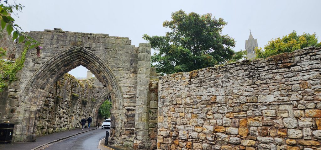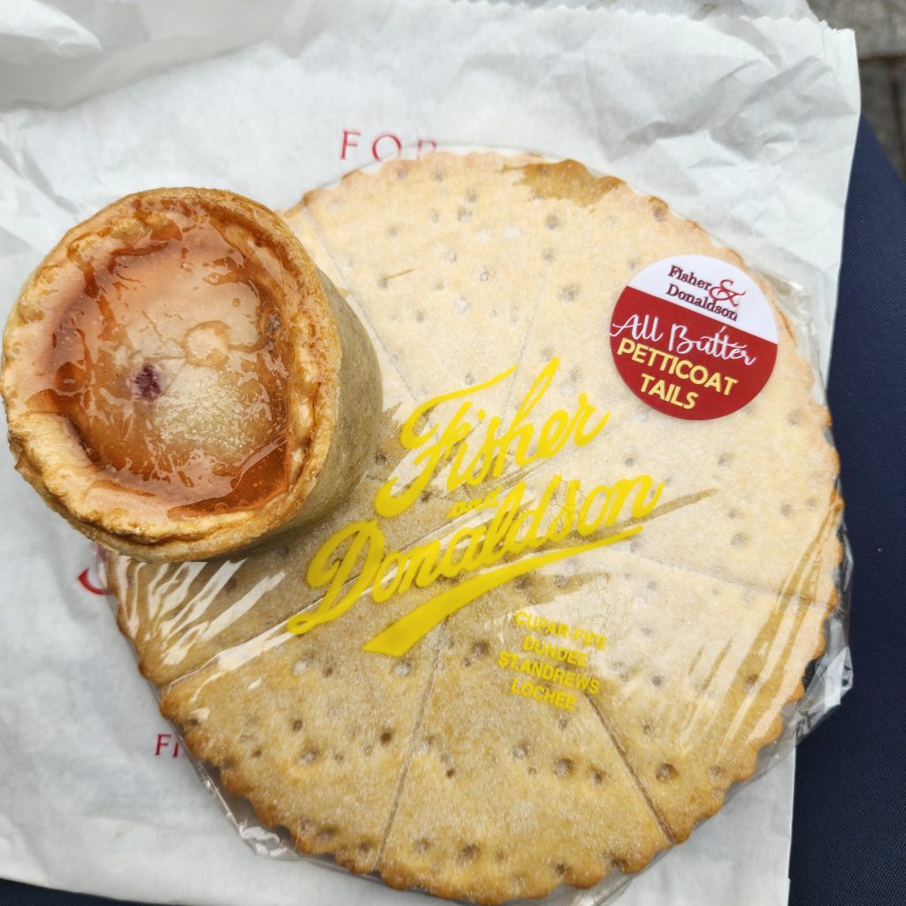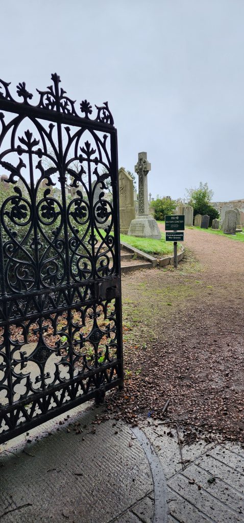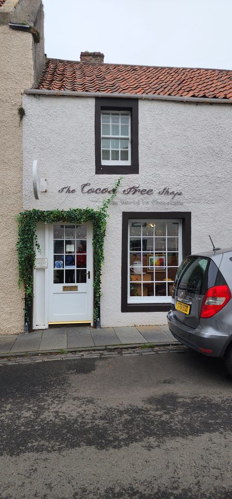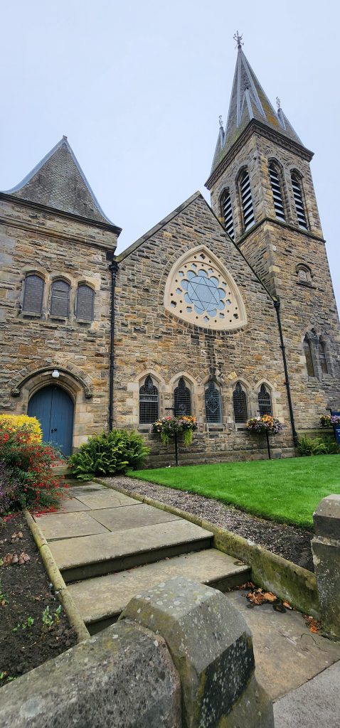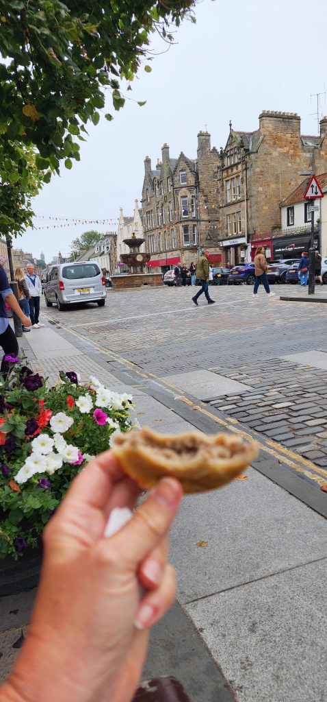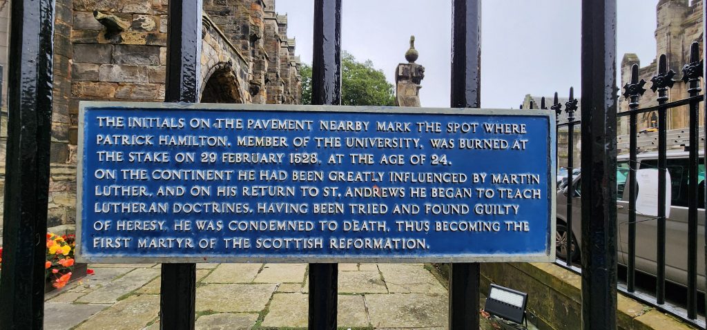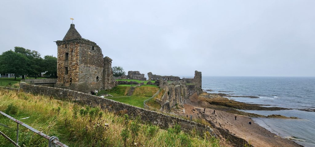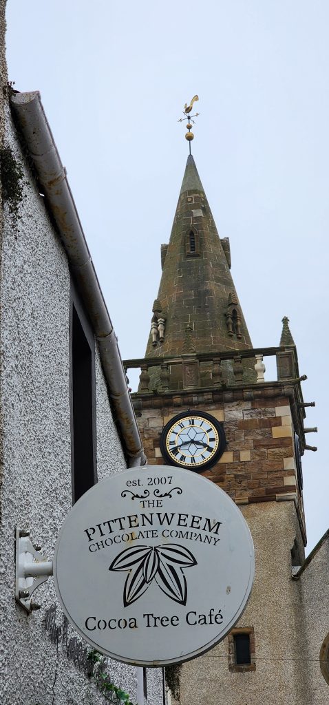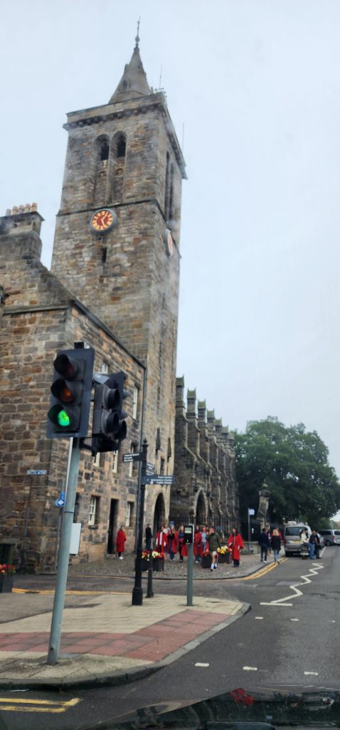 England/Scotland 2024 Pilgrimage – Day 8: Dundee, St. Andrews, Pittenweem September 8, 2024December 18, 2024Sunday, September 8, 2024Foggy SundayThe fog was as thick as split pea soup this morning. It had lifted enough to not inhibit driving, but we went over a very long bridge and saw nothing but the road and the cable-stays going up into the clouds. A perfectly lovely Scottish day.Church in DundeeDriving just over an hour, we went to Dundee to worship at Gilfillan Memorial Church, a Congregational Church. Why, you ask, did you drive all that way to go to a church denomination that you’ve not even mentioned during this trip? Well, I’m glad you asked. Let me preface it with this.Have you read the Sensible Shoes novels?If you’ve talked books with me, you very likely have heard me rave about the Sensible Shoes novel series by Sharon Garlough Brown. It is a down to earth, relatable, soul-care slice of life stories of four women who become friends at a spiritual retreat. She has three other novels and a children’s picture book. Sharon is a spiritual director which is evadent in her writings.I’m on Sharon’s email list and have been on several of her book launch teams, so it feels like I “know” her a bit. She had shared that she and her husband moved from the USA to Scotland for him to pastor a church. When we decided to do this trip, I emailed her and asked, if it didn’t feel like I was stalking her (let’s be real, I WAS), would she share the name of their church. IF we were in the area on a Sunday, and that was a HUGE “if,” we might possibly join them in worship.Gilfillan Memorial ChurchSo here we are on a Sunday, an hour plus from their church… and in the general direction of where we were headed anyways! So, yup! I jumped on the stalking wagon and headed to church.Probably half of their small congregation was “on holiday” today, so there were 20ish people there. The building is old and beautiful. Curiously, it is sandwiched between other businesses. It is like row houses, but businesses. The whole block seemed to be one huge building, portioned out.Jack and Sharon BrownIt was a blessing to worship with them. Sharon and Jack were gracious and we enjoyed talking together after the service. Jack is very interested in the same era of church history that Gregg has been focused on during this trip, Celtic Christianity in 500-700 AD-ish.As we talked, he recommended several books. One is historical fiction over 900 pages. I’ll probably let Gregg read that one and tell me the highlights. That, or we go on a VERY LONG road trip and listen to it on audio. But wait, as I was typing this, Gregg was looking up the book and informed me that it is 1,134 pages. This girl is a slow reader so the odds are great that I’ll pass on that book. (Glastonbury: The Novel of Christian England by Donna Fletcher Crow)As we talked, Sharon told us a story of them going to a small town for hot chocolate. Afterwards, you “ask for the key.” It is a key to unlock the cave where a monk lived in the 700s. Hot chocolate AND an adventure?! Who’s in?! MEEEEE!Who knows, maybe someday our paths will cross again. Jack was signed up to pursue a doctorate at IWS (Institute of Worship Studies) in Jacksonville when Covid cancelled that plan. We invited them to stay in our home should he decide to do the online version which requires students to be on-site a few weeks a year.University of St. AndrewsSpeaking of Covid, we had reservations and tickets for a vacation in St. Andrews, Scotland, in 2020. We were going to stay in dorm housing since students would be gone for the summer. The plan was to do day trips, hiking along the Fife Coastal Path and explore the area for a week, then fly to Ireland for a week.Since that didn’t happen, we HAD to include St. Andrews in this trip. Curiously, it was impossible to get a place to stay anywhere near there. Today we found out why. This weekend, the incoming freshmen and their families were in town. The “freshies” wore (or carried) red capes. Between that and the old buildings, it felt like a Harry Potter movie. Here is a bear wearing one:By the way, The University of St. Andrews is Scotland’s oldest university, founded in 1413. Just try to wrap your head around that one. Students were learning here before the Gutenburg Printing Press was invented in 1440, before “1492, when Columbus sailed the ocean blue,” over a hundred years before the Reformation, and 363 years before America was born. Not to mention, over a thousand 611 years prior to today. [Edited after I actually did the math. It is still a long time, but NOT 1,000 years.] Hard to grasp!Scottish Meat PiesSharon also told us the name of a good bakery “across the street” were we could get Scottish Pies. When I came here in 1986 with Kathy, we were on a budget trip. We’d go into bakeries and each get a meat pie. It was a pastry in the shape of a small deep-dish pie, filled with finely ground meat. The Dundee bakery was closed today BUT we found one in St. Andrews. Oh, my heart!We each got a warm Scottish Pie and shared a rhubarb tart and a large shortbread cookie. We sat on a bench facing a busy street to eat and enjoy people-watching. The spices in the pie instantly took me back to my 26 year old self, traveling overseas for the first time. It was the perfect comfort food on this foggy and very Scottish weather day.Quads and Castles and CathedralsWith full bellies, we walked around town. We saw a spot where the first Scottish Reformation martyer, Patrick Hamilton, was executed for heresy in 1528. It was just outside the entrance to the Quad – a wide grassy square with buildings on all four sides. From there we walked to see the castle ruins, followed by the HUGE St. Andrews Cathedral ruins.Hot Chocolate in Pittenweem FifeOnce we had seen all we wanted to see in St. Andrews, we were off to Pittenweem. The half hour trip was VERY foggy as we drove a long the North Sea coastline. This 