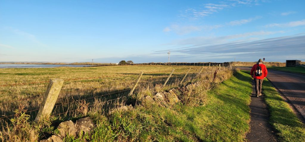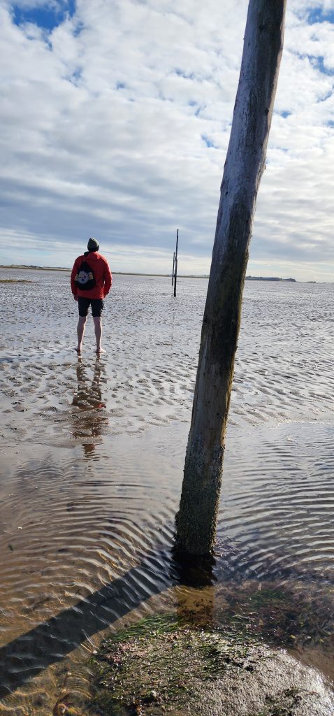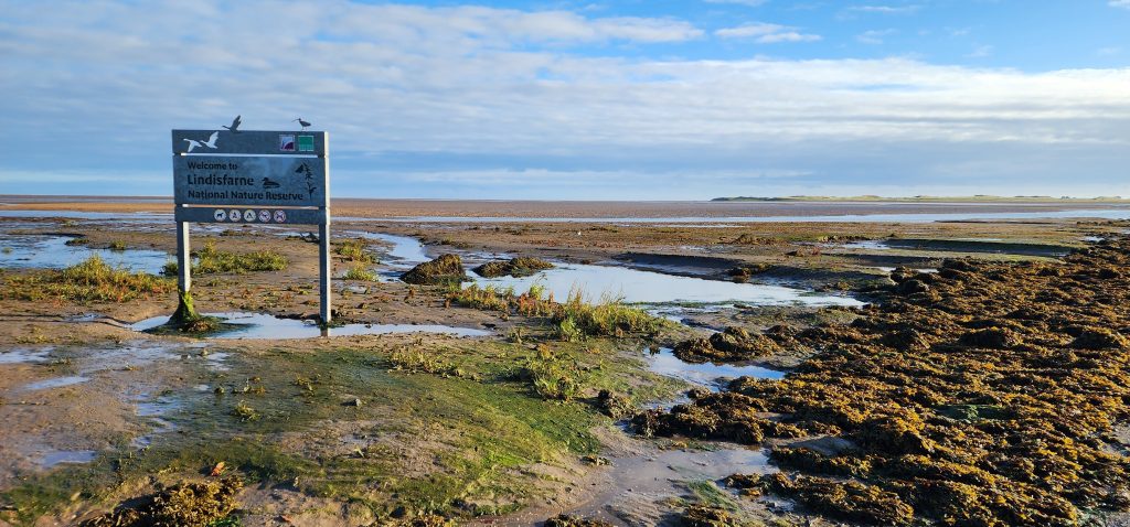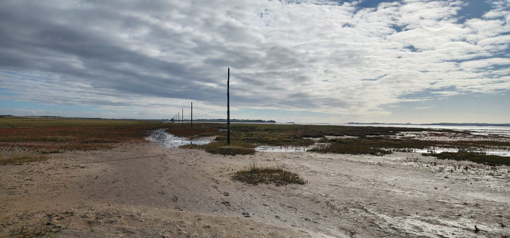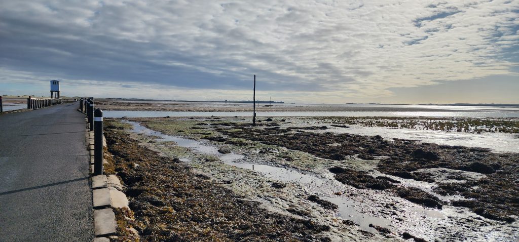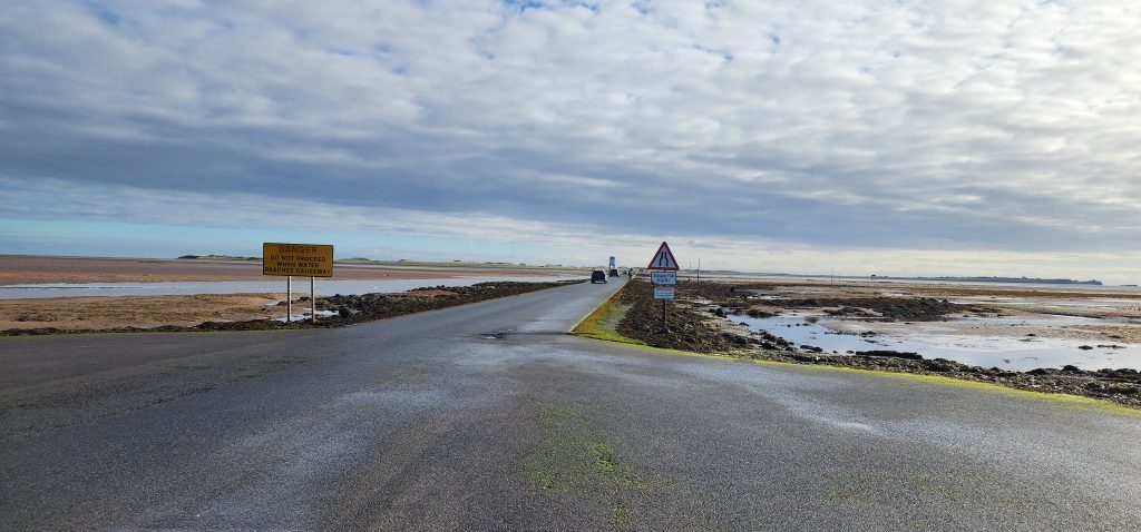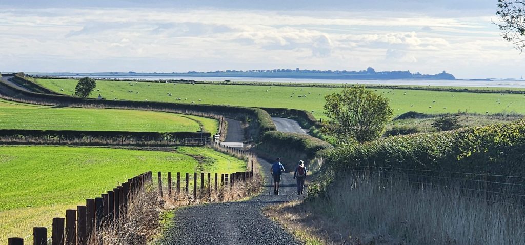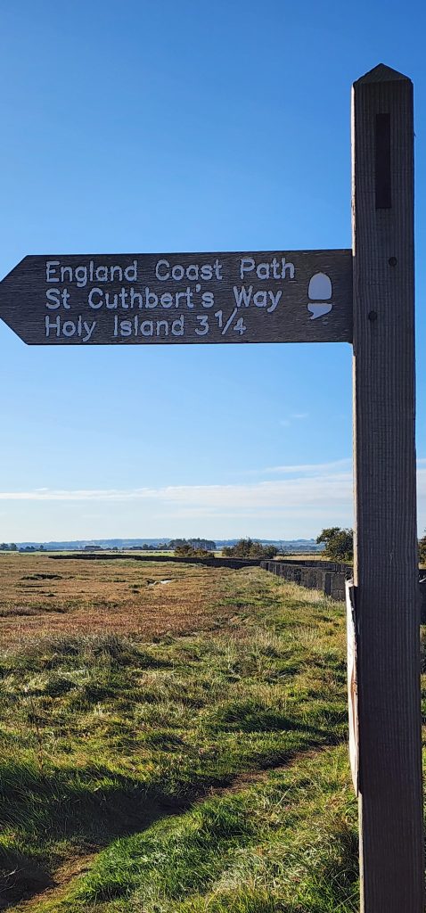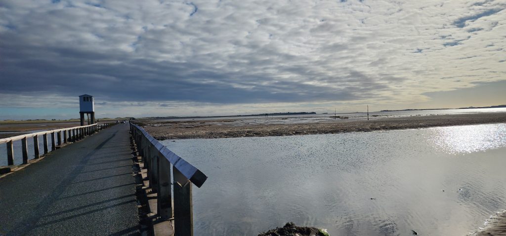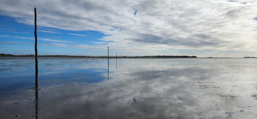 Lindisfarne Pilgrim’s Way – Day 5 of 2025 England Pilgrimage September 23, 2025September 23, 2025Tuesday 9/23/2025MY STARS! The stars could be seen in hordes last night along with the Milky Way. Ever since we made reservations here and I saw that the moon would be in its Waxing Crescent phase, I’ve been hoping for clear night skys. Thanks be to God for the privilege of seeing His glorious handiwork!Our long awaited Pilgrim’s Way walk became a reality today! We were up and out of the guesthouse before 8am. Man, was it nippy! The temperature was 46, feels like 41 degrees and breezy. But we layered – several shirts, then a sweatshirt, then a windbreaker, and Gregg wore a winter beenie and I had my earmuff band and gloves. So we were fine. And by the time we began walking in the sand, we were warmed up. Well, our feet weren’t once we took our shoes and socks off but they quickly became numb so no worries.I’m getting ahead of myself.We walked 3+ miles a long the causeway to the mainland. The plan was to start walking back around 9am. But once we got to the start/turn around point, nature was calling. Eek! Definitely no toilet facilities would be found once we began, so we walked an additional half mile to a cafe and another half mile back. We bought a “flapjack” to take with us – a square oatmeal pastry with fruit in it. Like a brownie, but made with oatmeal (and no chocolate.)History refresher: Saint Aiden was the first monk to come to Lindisfarne (northeast England), along with (probably) a dozen others. In 635 AD, the Northumbrian King, Oswald, requested the monks at Iona (southwest Scotland island) to send monks here to share the Good News of Christ with the people in his kingdom. Saint Aiden mentored Saint Cuthbert and then left him in charge of the LIndisfarne monastery.Reminder: Lindisfarne (now called Holy Island) is a tidal island. Twice a day it is cut off from the mainland by high tide.There are poles lined up from the mainland to Lindisfarne (Holy Island) to guide the way across the tidal flat when the tide is out. Cuthbert didn’t have that advantage. This section through the tidal flat, called Pilgrim’s Way, is just a portion of a longer pilgrimage trail called St. Cuthbert’s Way.The Pilgrim’s Way poles begin on the mainland side of a stream which never completely recedes. That stream is big enough to warrant a one-lane bridge for cars to cross. There was a lot of seaweed on the mainland side of the stream and we had no idea how deep the stream was, so we crossed it via the bridge and began walking in the sand on the Holy Island side of the stream. I know, Cuthbert didn’t have the luxury of a bridge when he made the trek.The hosts where we are staying (highly recommend) at the Belvue Guesthouse calculated a recommended start time of 9am. The “bio-break” caused us to start at 10am but that was not a problem at all. We finished around the peak (?) of low tide.After crossing the bridge, we sat down on a rock wall, took off our shoes and socks, rolled up our pants, and began our pilgrimage walk. There were many parts of hard sand even though it was wet. There were other areas of slick mud. We laughed and pretended to be kids again in sections of muddy sand which ozzed up through our toes as our feet sunk up to our ankles. We waded through water (which was never more than ankle deep) and we gingerly walked over grass and some type of sea grass/growing sea weed (?)As we walked the Pilgrim’s Way, we thought about all the Celtic Christian pilgrims who have walked this “path” for over 1,300 years. That’s hard for me to grasp.Today was a “How Great Thou Art” day and I sang the song over and over in my head as we walked each direction. Brandi and I first started this tradition on our Alaskan cruise in 2016. It is so fitting and lifts my heart to God.O Lord my God, when I in awesome wonder consider all the works Thy hands have made, I see the stars, I hear the rolling thunder, Thy pow’r throughout the universe displayed! Chorus Then sings my soul, my Savior God, to Thee; How great Thou art, How great Thou art! Then sings my soul, My Savior God, to Thee; How great Thou art, How great Thou art! Carl Boberg, 1886We talked with a British couple who began walking just after us and ended as we were putting our shoes back on. They have been on a 10 day holiday walking about 75 miles. They have walked all over the UK and world including the Camino in Spain. It sounds like they make lodging reservations for each night, similar to what we did on our bike trip from Pittsburgh to Washington, DC.I was BUSHED at the end. We’ve walked over 10 miles today before lunch. Soup sounded good, so we found a cafe that had tomato soup and a cheese scone. Then we returned to our guesthouse for a shower and a few cups of tea.There are many other trails we could investigate here on the island, but I just didn’t have the energy. So we’ve been relaxing in our room, eating biscuits (Shortbread Fingers!), and I think Gregg mysteriously helped me get my blog to begin sending again. A mystery. I told it to send immediately after I publish a post.That first email had an old post from 2024 at the beginning. But after that, the blogs from this trip begin. If you use Gmail, your email was likely trunkated after Day 3. If you look at the bottom lefthand side of your email, it might say: [Message clipped] View entire message. Clicking on the link takes you to the whole email including Day 4.We decided that we will pass on attending 5:00 evening prayers. We have a 6:15 reservation at The Ship Inn. We had requested reservations months ago. Yesterday I realized that our “confirmation” email from Visit Lindisfarne said we should receive a follow-up confirmation from the restaurant. But we didn’t. So we dropped in yesterday to ask. Sure enough, we did NOT have a reservation and the main dining room was already booked up (typical on the island.) He did say he’d save us a tab