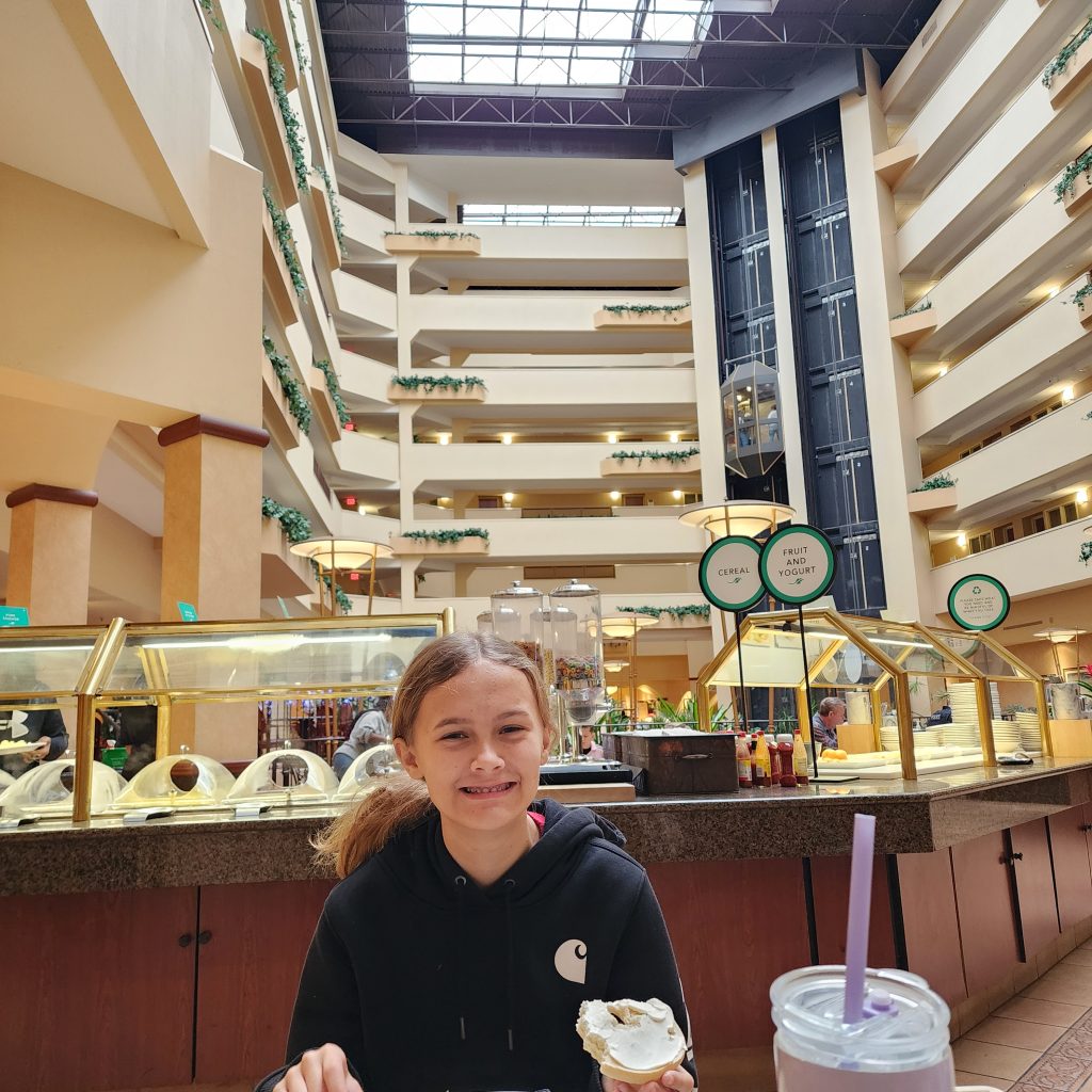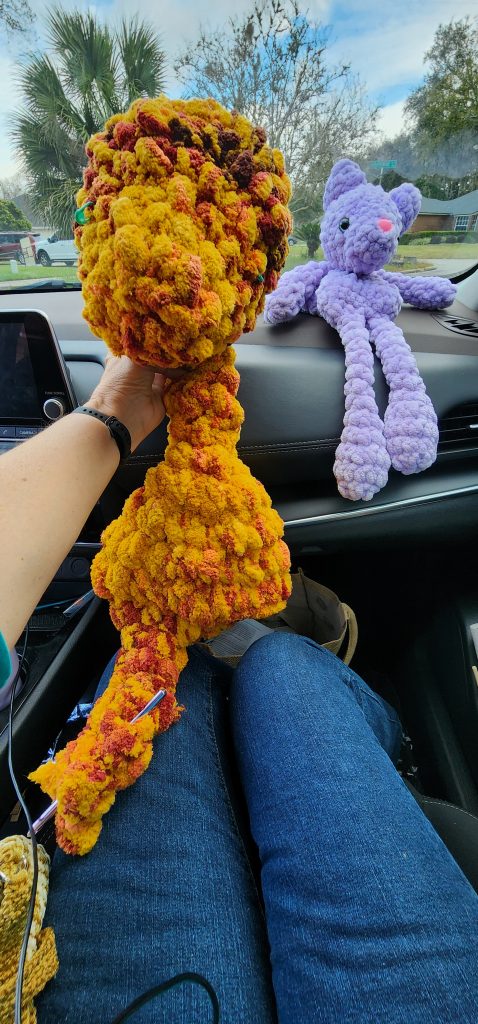 Narnia Road Trip Day 8 – Safely Home December 23, 2023January 1, 2024Friday, December 22, 2023We are becoming breakfast critics. Today’s Embassy Suites omelets were good yet the Pittsburgh Embassy Suites breakfast won the first place award for hotel breakfasts on this trip.We left Columbia, South Carolina by 9am, the girls having slept in until 7:30. Catching up on sleep feels good.As we drove, we finished listening to Narnia book #5, listened to #6 – The Silver Chair, and are 2 hours away from finishing the last book in the series, The Last Battle. C.S. Lewis has woven beautiful tales which can also be read as faith allegories. Reading (listening to) the whole series within the span of a week helps tie them together, although they can be read separately and out of order.Traffic wasn’t bad (thanks to Gregg taking back roads) until we got on I-95 in South Carolina, near the Georgia border. Though we drove around 50mph, 95 has often been much worse. I suspect tomorrow will be a nightmare so it is good to have left a day early.We arrived in Jax around 2:30ish. Since Ladybug was scheduled to be with us until Saturday, she’s spending the night with us.After unloading the car, we returned the rental and ran errands – library, grocery store, and Michael’s for more yarn.I began making another lovie today as we drove, this one with Aunt Kitten’s colors. I hadn’t been able to find yarn that might look like her until Ladybug and I went to Michael’s in West Virginia. And this yarn was very thick, for making soft blankets.The pattern is the same as the lavender lovie, yet the size of the yarn is making her huge! Haha! I used both skeins of yarn I had purchased to make her head, body, and most of one leg. She may be too big to qualify as a “lovie” by the time she’s done.The soft yarn sheds and so my side of the car looked like it had snow which hadn’t melted. Too funny! I worked on Aunt Kitten some more this evening after supper while we listened to more Narnia.We made homemade ice tonight – chocolate with mini chocolate chips. Ladybug picked the flavor. Good choice!Thanks for joining us on our road trip! A fun time was had by all! I do apologize that email notifications were sporadic. The reason is a mystery which I hope to solve once I get back onto my computer instead of the cell phone.If you missed any posts (like Day 2 when I explained why we are calling it the Narnia Road Trip,) all posts can be found under the TRAVEL category on my website, www.KristinEmilyFriend.com.Tomorrow is my sister, Bryn’s, birthday. She is celebrating with a square dance party. Better get my rest so I’m ready. Travels