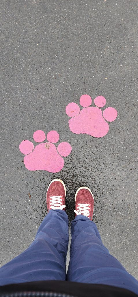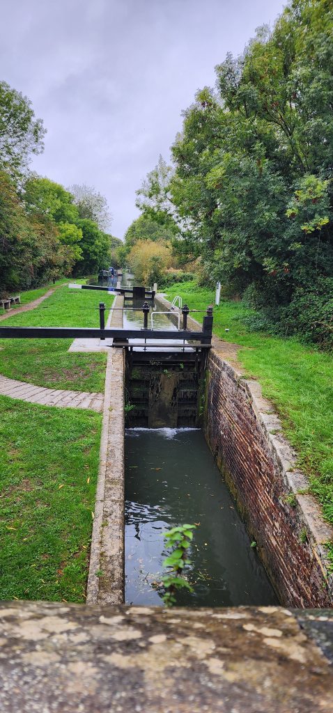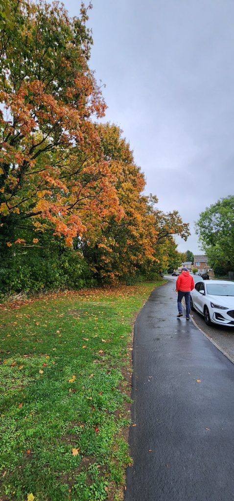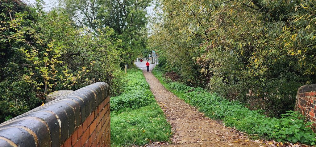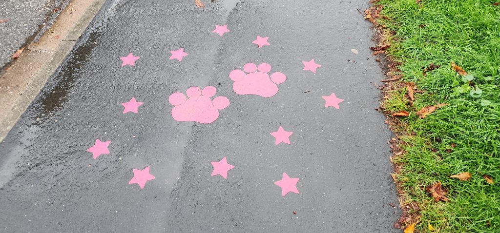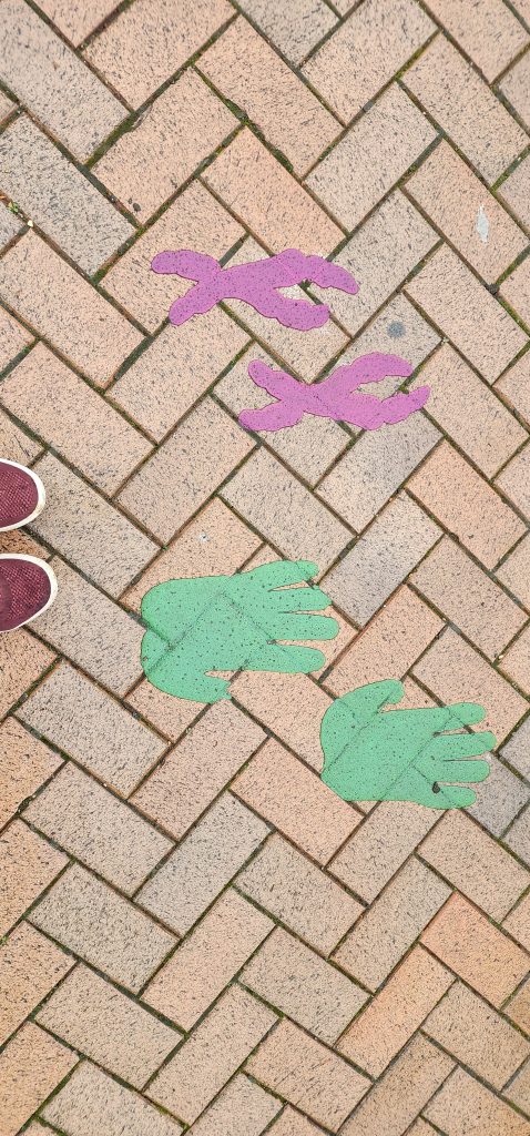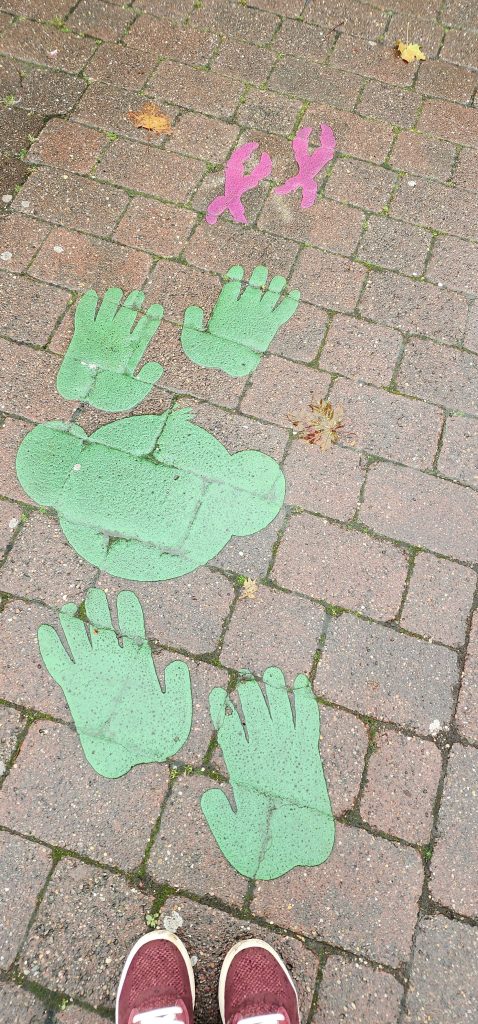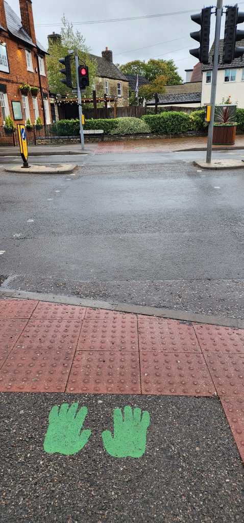 Quiet Day in Kidlington – Day 15 of 2025 England Pilgrimage October 3, 2025October 3, 2025Friday 10/3/2025Today is rainy so we decided to have a quiet day at the house. Well, actually, we first walked into Kidlington to pick up a few grocery items at the Tesco while it was still just drizzling. We took the towpath to the right, walked to the first locks and went over canal via the walking bridge, crossed the train tracks which nicely had lights to tell us it when it was safe to cross, then walked through neighborhoods to emerge at the shopping area. It was nice to not have to walk alongside the busy road.There are hands, feet, paws, and ? on the sidewalk. I’ve not figured out what it represents, but may have something to do with their “welcome back” campaign after COVID lock down.I stopped by Stanley’s Sweets and Treats and the sweet proprietor showed me the syrup she used for the pumpkin spice milkshakes. Now, to find it in the States!Once back at the house, we’ve read, ate left overs from yesterday’s chipper take-away, Gregg worked on his computer, and I helped Jennie with some sewing/mending things.We pick Steve up at the bus stop at 4:30 and the four of us will drive to Salisbury. Steve has a rental house there where we will stay tonight and tomorrow night. Lots to see over there!Sorry – my pictures are backwards chronologically again. No time to fix. 2025 England Pilgrimage - Part 2 Travels Great BritainTravels