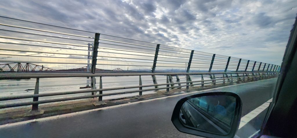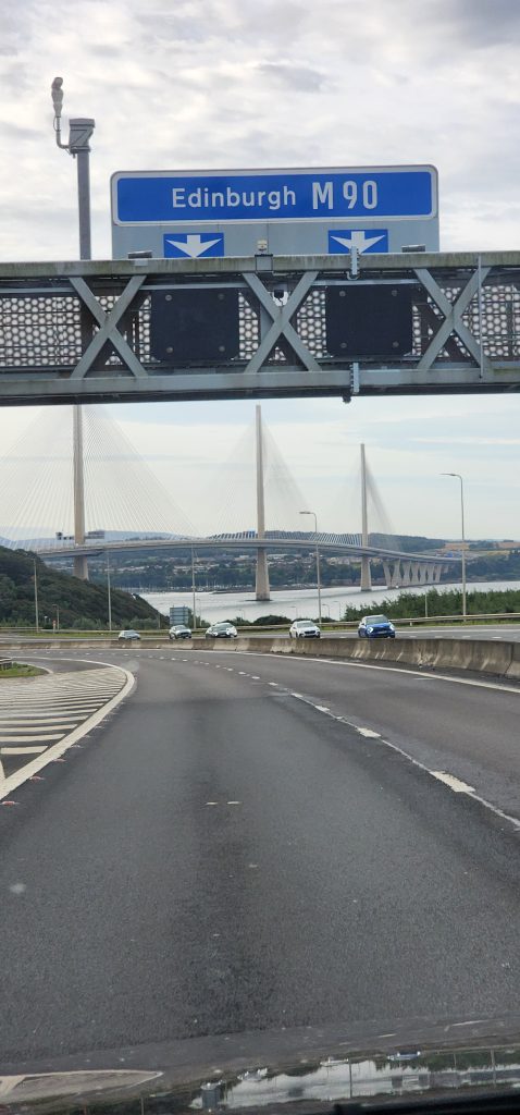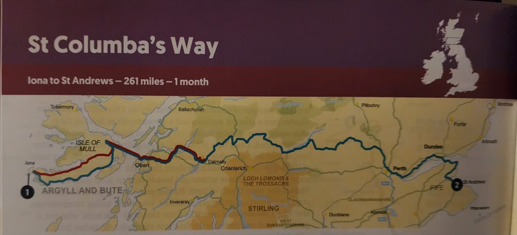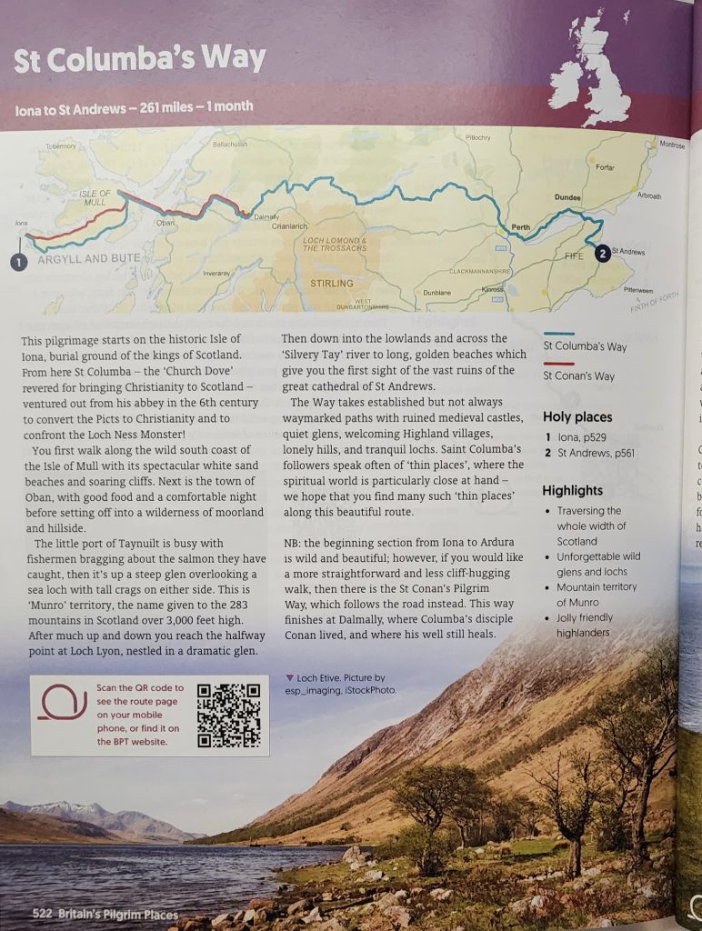 Saint Columba’s Way September 9, 2024September 9, 2024Monday, September 9, 2024Iona to St. Andrews is St. Columba’s WayGregg realized some people take a month to walk the route we did by a 3-day drive going from Iona to St. Andrews.Here is a picture from his British National Trust Pilgrimages book.We see the bridge!As we make our way south, out of Scotland, we had to re-cross yesterday’s bridge-in-the-fog. Today is cloudy but not foggy so we were able to see it as well as other bridges crossing the bay. 2024 England/Scotland Pilgrimage Travels Great BritainTravels