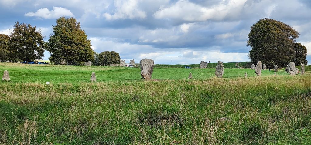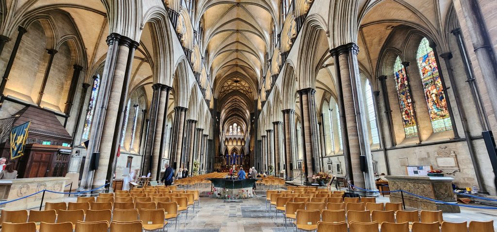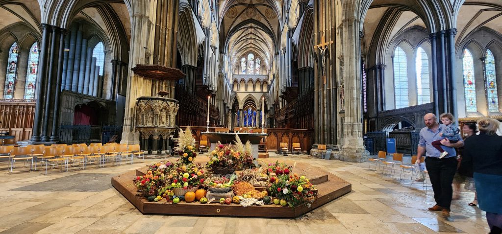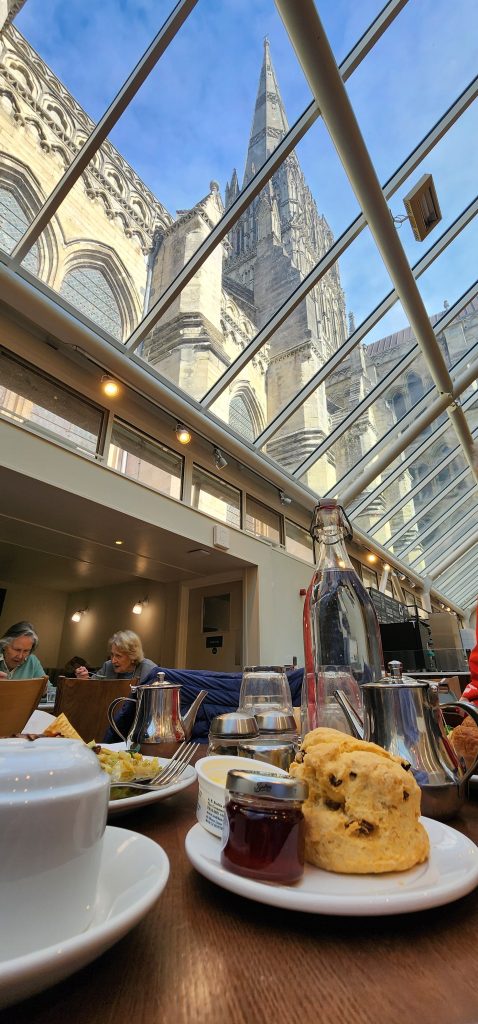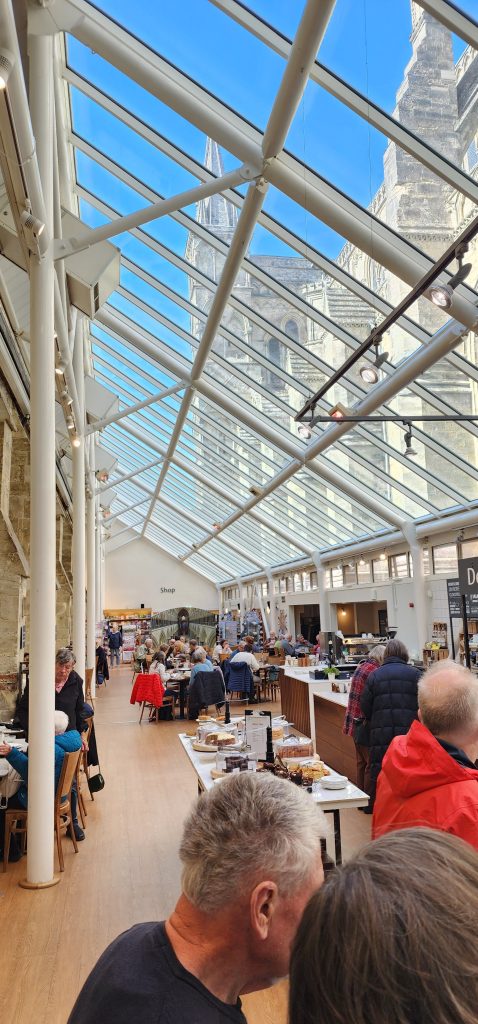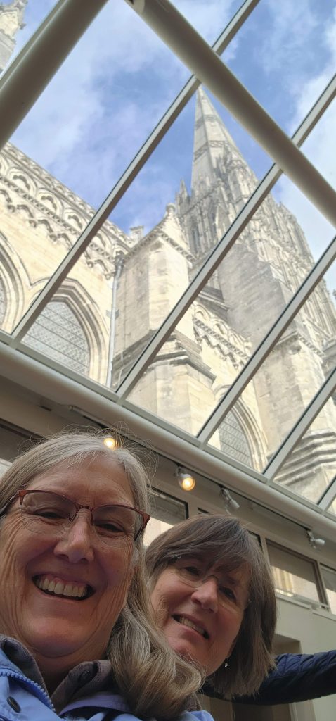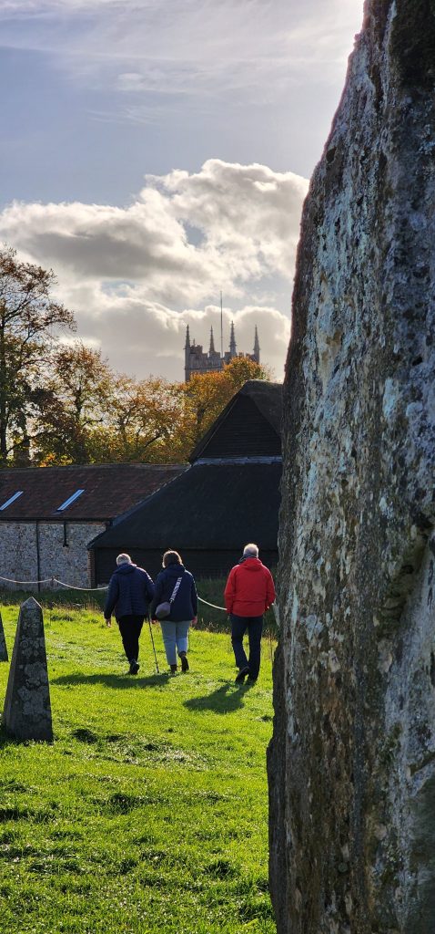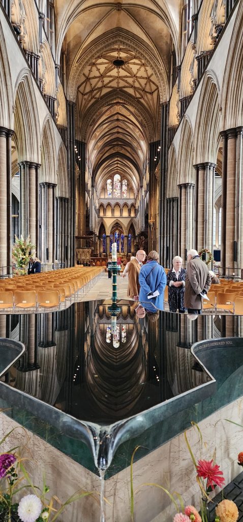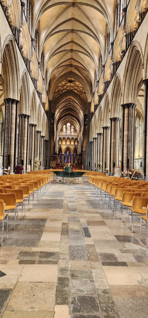 Salisbury & Avebury– Day 17 of 2025 England Pilgrimage October 6, 2025October 6, 2025Sunday 10/5/2025Today was packed full of wonderful experiences and gems. Though we saw a lot, I didn’t feel rushed. We just enjoyed the journey together as the day unfolded.We knew we all wanted to begin with church at Salisbury Cathedral. The Eucharistic Service was at 10:30.After easing into the morning with coffee or tea and a light breakfast at Steve’s cozy row house, we walked 10ish minutes to the Cathedral. The rain had passed but it was still a blustery day. Even so, it was a lovely day to be outdoors.I was rather surprised at the crowd that attended the service. The Cathedral was nicely filled… with people in coats, boots, scarves, and some with gloves. They came prepared, knowing that the heat isn’t turned on until late October. The bulletin states:We are carefully monitoring temperatures as we head into autumn. We plan to turn on the Cathedral heating towards the end of October, as usual. Please dress appropriately during this transition period. This arrangement supports our environmental aspirations: even in the martingale months of April and October, heating the Cathedral for just one day emits as much carbon dioxide as it takes 24 mature trees a whole year to absorb. – Kenneth Padley, Canon TreasurerNobody seemed to mind. And many people stayed for coffee after the service so the chill in the air may have encouraged that social time. It was lovely to see everyone enjoying each other. Jennie and Steve saw some friends and had a nice chat catching up. (I liked their style of walkers – light, easy to fold up, but expensive in the US.)There was a “fair trade” table set up in the back as well. We bought a dark chocolate Advent calendar.Thanks be to God, the big screens from yesterday were gone. No more Frosty the Snowman pictures blocking the view through the quire to the Martyrs Window. Gregg commented that of all the Cathedral’s we have visited, this may by his favorite. The stonework in the lower columns includes dark gray. As your eye goes up towards the high ceiling, the colors and space become lighter. It instinctively lifts your eyes up, which also lifts our hearts and spirits up towards God.The alter was beautifully decorated for fall because it is their Harvest Festival – a day of thanksgiving for farmers and the food God has provided us through them. The congregation was invited to bring non-perishable items to be distributed through local charities.I don’t think I commented on the font yesterday. It is large, beautiful shape, filled with water that overflows on four corners and is recycled back. Though the water is flowing, the water looks still. The reflections in the water are gorgeous. There was a baptism yesterday afternoon. I bet it was a very special service around that font.Much of the service was sung. The whole service was special.There was a men and boy’s choir who sang throughout the service. Their voices were beautiful and the acoustics allowed their voices to fill the Cathedral. They say in chairs to the side and back of the alter, not in the quire, which was further behind the alter that was used.No incense was used in this service. The past two weeks we attended more “high church” services which did include incense. The fragrance is a memory-connection to Christmas Eve Midnight Mass at St. Mark’s Episcopal Church in Cocoa, Florida as a teen. That is the church Jennie attended a long with several other good friends such as Anne and Susan.Looking back on my life, I love how God introduced me to the Episcopal Church in high school. Then He used the Episcopal Church to draw me back to Himself before I met Gregg. I had become hurt, disillusioned and angry with God and walked away from Him during college. Life without God felt empty and I eventually chose to seek King Jesus again. Once married, I introduced Gregg to Christmas Eve Mass and it had become a cherished family tradition. Then, September 17, 2023, Gregg and I became confirmed in the Episcopal Church (which is part of the worldwide Anglican Communion led by the Archbishop of Canterbury.)And now, during our second Pilgrimage visit to the United Kingdom, the next Archbishop of Canterbury has been announced. It is a historic moment. The first woman has been appointed Archbishop. I watched a video interview of Bishop Sarah Mullally, the current Bishop of London, in which she shares her faith and vocation journey. It is interesting and encouraging. Here is a short written bio about Bishop Sarah.After church and coffee hour, we went to the Cathedral’s Cafe for lunch. The ceiling is glass, so we sat under the spires as we ate. So lovely! Gregg and I shared a “Sunday Roast,” a very traditional English meal on Sundays. It included roast pork, roasted potatoes, carrots, and parsnips, bread pudding, and cabbage salad. We also shared a fruit scone, but I didn’t share my small pot of tea that came with the scone. It was all very delicious.We didn’t see the Magna Carta yesterday so the guys went to see it (our tickets are valid here for a year) while the girls browsed the gift shop.After one last walk through Canterbury, we returned to the townhouse, packed up, and headed out. There were many options, including going straight home, but I am tickled about the option we chose.Driving through country roads through the rolling countryside, we went to Avebury. (pronounced with a long A) It is a World Heritage Site. The village is surrounded by a stone circle – standing stones similar to those at Stonehenge. Outside of that circle is a deep ditch, then a steep hill – presumably made from the contents dug out of the ditch. One of the many mysteries is that the hill is outside the most which indicates the ditch and hill were for keeping people (and animals?) inside the ring rather than protection from those outside the ring.The mystery of it all is magnified by the fact it was constructed somet