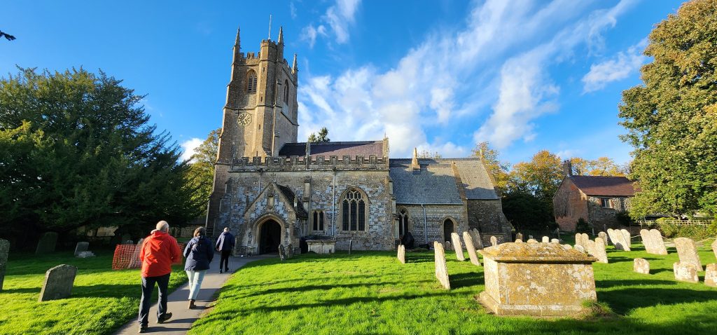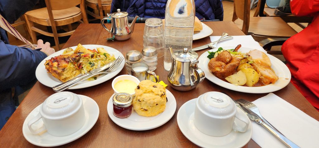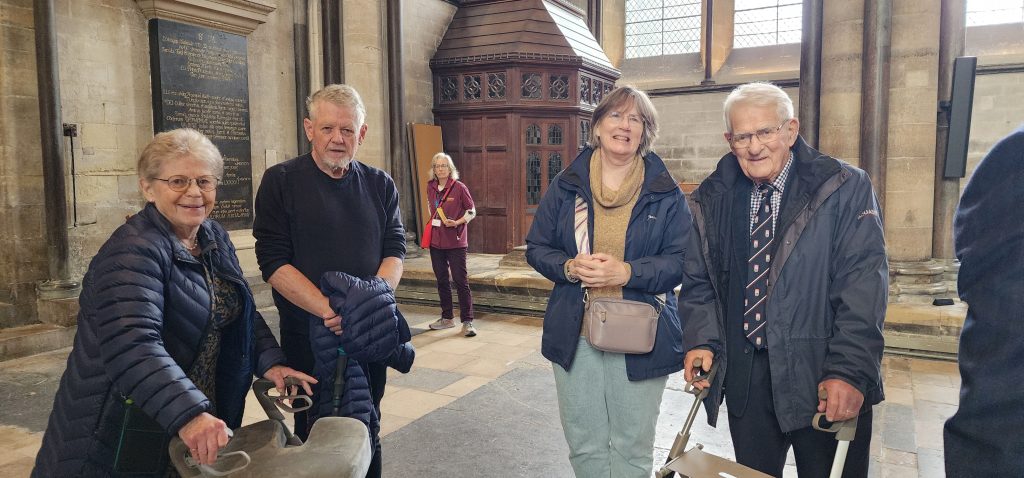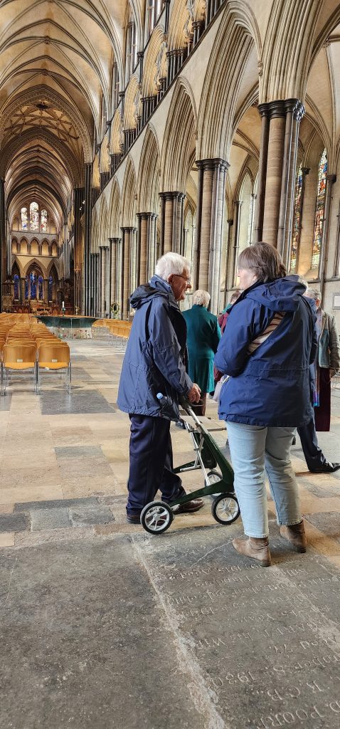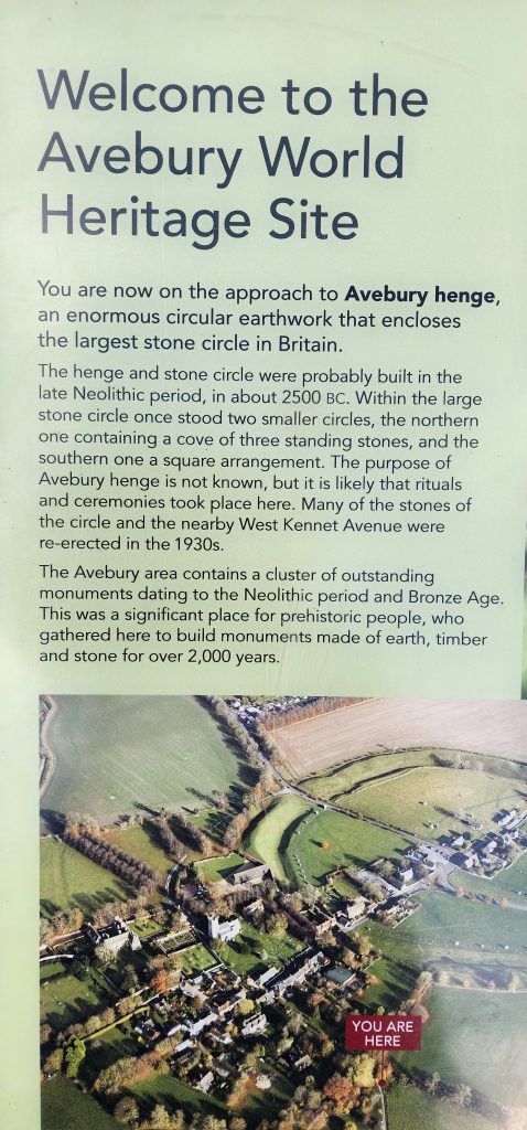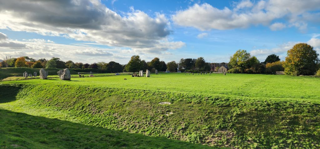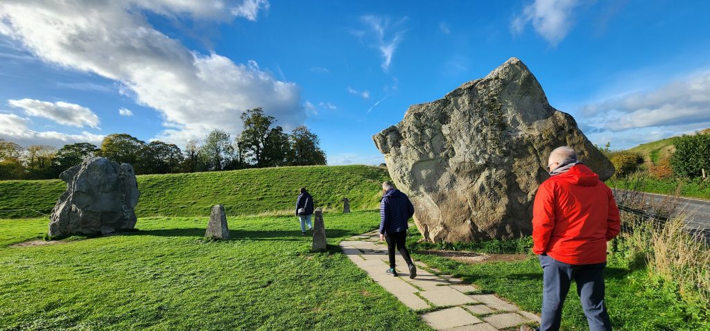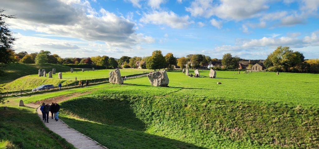 Salisbury & Avebury– Day 17 of 2025 England Pilgrimage October 6, 2025October 6, 2025Sunday 10/5/2025Today was packed full of wonderful experiences and gems. Though we saw a lot, I didn’t feel rushed. We just enjoyed the journey together as the day unfolded.We knew we all wanted to begin with church at Salisbury Cathedral. The Eucharistic Service was at 10:30.After easing into the morning with coffee or tea and a light breakfast at Steve’s cozy row house, we walked 10ish minutes to the Cathedral. The rain had passed but it was still a blustery day. Even so, it was a lovely day to be outdoors.I was rather surprised at the crowd that attended the service. The Cathedral was nicely filled… with people in coats, boots, scarves, and some with gloves. They came prepared, knowing that the heat isn’t turned on until late October. The bulletin states:We are carefully monitoring temperatures as we head into autumn. We plan to turn on the Cathedral heating towards the end of October, as usual. Please dress appropriately during this transition period. This arrangement supports our environmental aspirations: even in the martingale months of April and October, heating the Cathedral for just one day emits as much carbon dioxide as it takes 24 mature trees a whole year to absorb. – Kenneth Padley, Canon TreasurerNobody seemed to mind. And many people stayed for coffee after the service so the chill in the air may have encouraged that social time. It was lovely to see everyone enjoying each other. Jennie and Steve saw some friends and had a nice chat catching up. (I liked their style of walkers – light, easy to fold up, but expensive in the US.)There was a “fair trade” table set up in the back as well. We bought a dark chocolate Advent calendar.Thanks be to God, the big screens from yesterday were gone. No more Frosty the Snowman pictures blocking the view through the quire to the Martyrs Window. Gregg commented that of all the Cathedral’s we have visited, this may by his favorite. The stonework in the lower columns includes dark gray. As your eye goes up towards the high ceiling, the colors and space become lighter. It instinctively lifts your eyes up, which also lifts our hearts and spirits up towards God.The alter was beautifully decorated for fall because it is their Harvest Festival – a day of thanksgiving for farmers and the food God has provided us through them. The congregation was invited to bring non-perishable items to be distributed through local charities.I don’t think I commented on the font yesterday. It is large, beautiful shape, filled with water that overflows on four corners and is recycled back. Though the water is flowing, the water looks still. The reflections in the water are gorgeous. There was a baptism yesterday afternoon. I bet it was a very special service around that font.Much of the service was sung. The whole service was special.There was a men and boy’s choir who sang throughout the service. Their voices were beautiful and the acoustics allowed their voices to fill the Cathedral. They say in chairs to the side and back of the alter, not in the quire, which was further behind the alter that was used.No incense was used in this service. The past two weeks we attended more “high church” services which did include incense. The fragrance is a memory-connection to Christmas Eve Midnight Mass at St. Mark’s Episcopal Church in Cocoa, Florida as a teen. That is the church Jennie attended a long with several other good friends such as Anne and Susan.Looking back on my life, I love how God introduced me to the Episcopal Church in high school. Then He used the Episcopal Church to draw me back to Himself before I met Gregg. I had become hurt, disillusioned and angry with God and walked away from Him during college. Life without God felt empty and I eventually chose to seek King Jesus again. Once married, I introduced Gregg to Christmas Eve Mass and it had become a cherished family tradition. Then, September 17, 2023, Gregg and I became confirmed in the Episcopal Church (which is part of the worldwide Anglican Communion led by the Archbishop of Canterbury.)And now, during our second Pilgrimage visit to the United Kingdom, the next Archbishop of Canterbury has been announced. It is a historic moment. The first woman has been appointed Archbishop. I watched a video interview of Bishop Sarah Mullally, the current Bishop of London, in which she shares her faith and vocation journey. It is interesting and encouraging. Here is a short written bio about Bishop Sarah.After church and coffee hour, we went to the Cathedral’s Cafe for lunch. The ceiling is glass, so we sat under the spires as we ate. So lovely! Gregg and I shared a “Sunday Roast,” a very traditional English meal on Sundays. It included roast pork, roasted potatoes, carrots, and parsnips, bread pudding, and cabbage salad. We also shared a fruit scone, but I didn’t share my small pot of tea that came with the scone. It was all very delicious.We didn’t see the Magna Carta yesterday so the guys went to see it (our tickets are valid here for a year) while the girls browsed the gift shop.After one last walk through Canterbury, we returned to the townhouse, packed up, and headed out. There were many options, including going straight home, but I am tickled about the option we chose.Driving through country roads through the rolling countryside, we went to Avebury. (pronounced with a long A) It is a World Heritage Site. The village is surrounded by a stone circle – standing stones similar to those at Stonehenge. Outside of that circle is a deep ditch, then a steep hill – presumably made from the contents dug out of the ditch. One of the many mysteries is that the hill is outside the most which indicates the ditch and hill were for keeping people (and animals?) inside the ring rather than protection from those outside the ring.The mystery of it all is magnified by the fact it was constructed somet