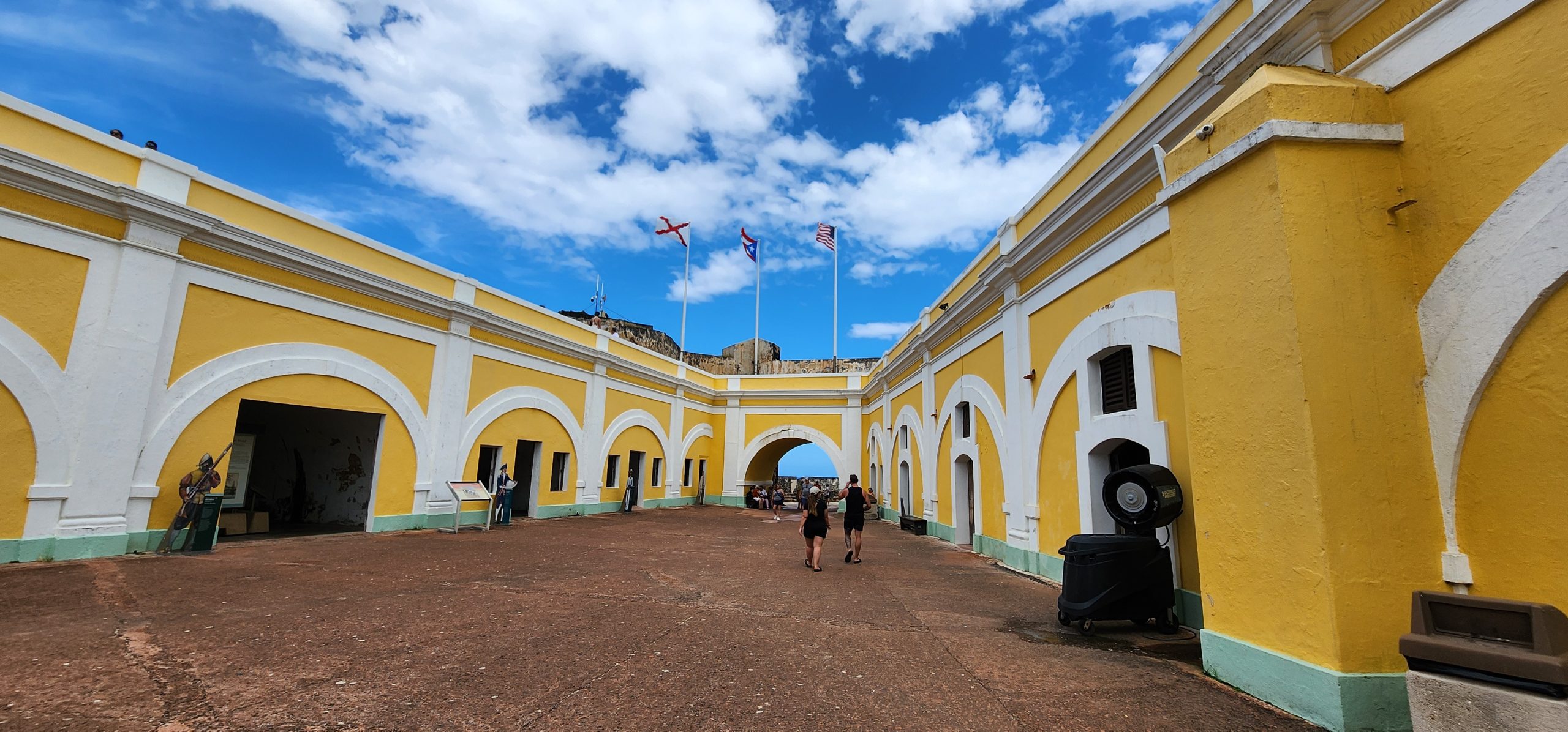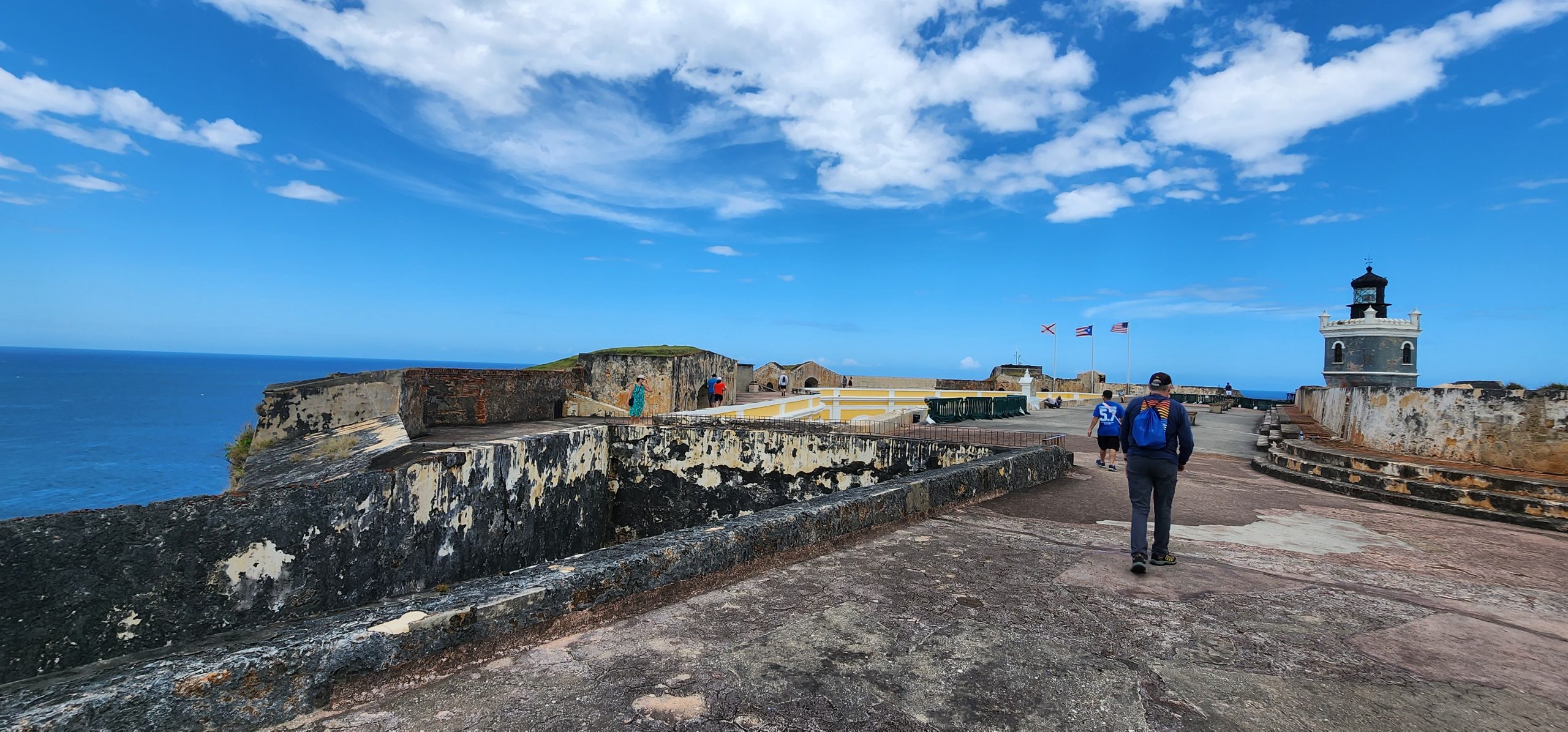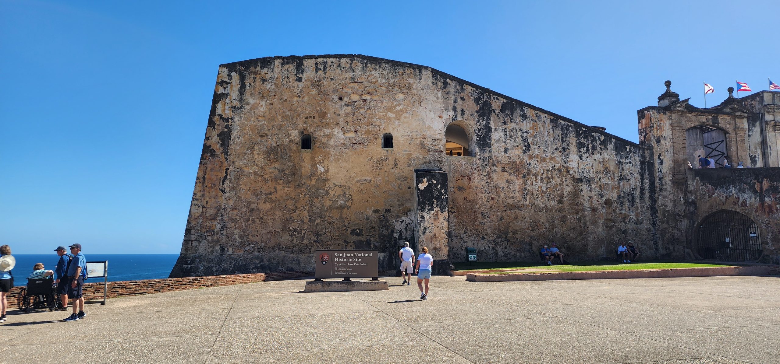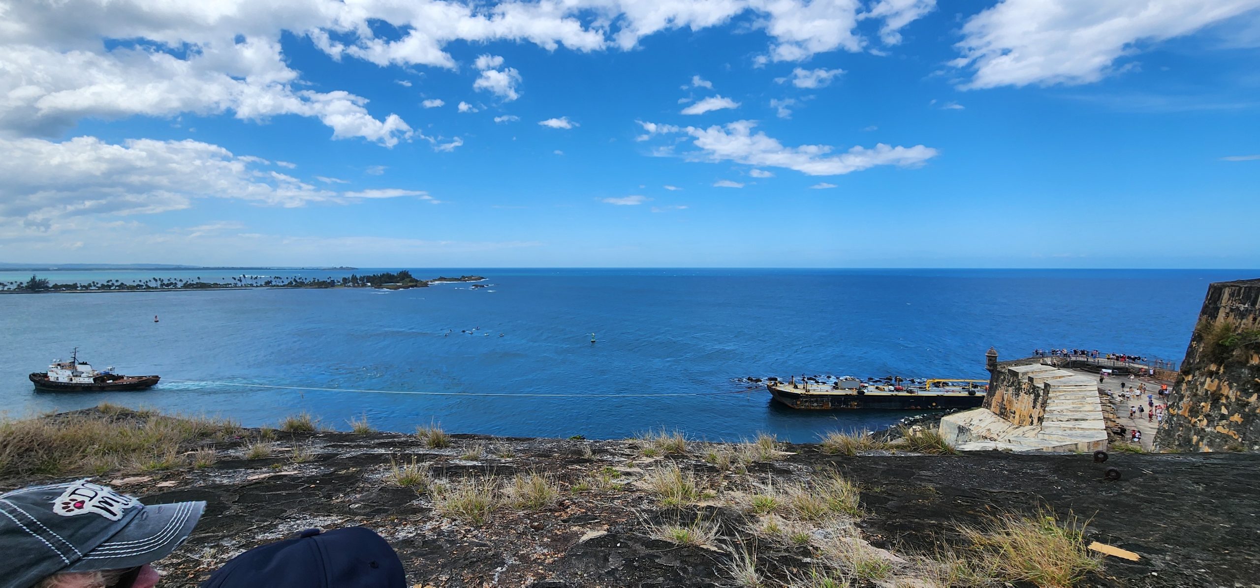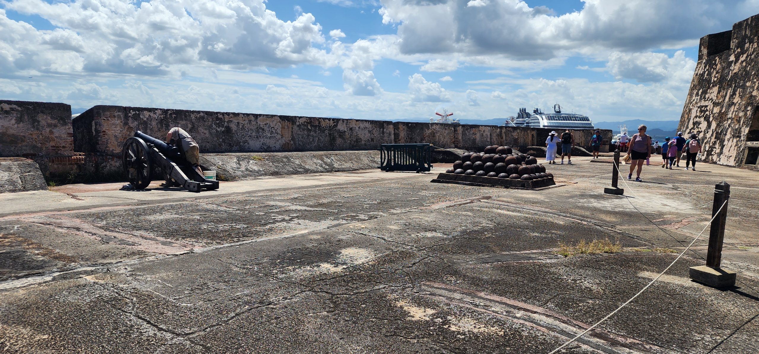 San Juan, Puerto Rico – Norwegian Gem Caribbean Cruise 2026 February 24, 2026February 24, 2026Tuesday, February 24, 2026We had a slow start this morning due to mistakenly changing our clocks last night. They actually need to be turned back an hour tonight.It was probably 10:00 am when we left the ship, an hour after we were permitted to go ashore. Gregg had done a quick search of things to see on foot from the San Juan port so he led the way. His first directional landmark was Walgreens. It was easy to locate since it is directly across the street from the port gate.He led us through town to Castillo San Cristobal, a San Juan National Historic Site. Thankfully, I read a tip to take my National Park Pass in case I wanted to use it in Puerto Rico. We were able to use it to get into this fort as well as another.Castillo San Cristobal reminds me of Castillo de San Marcos in St. Augustine, Florida. Though this fort is MUCH larger. and has many tunnels. It makes sense now, but I had never thought about this being a stratigic area to control for military and trade for the last 500 years. The two forts in San Juan also played important roles during World War I and II.From Castillo San Cristobal, we walked towards the fort at the mouth of the harbor, enjoying the ocean view down below as well as the colorful buildings on the opposite side of the road. Castillo San Felipe del Morro is surrounded by a huge grassy field. Between the wide open space and the constant wind coming off the ocean, it is the perfect place to fly kites. What a happy sight; I hadn’t seen kites in years.Spain began building Castillo San Felipe del Morro in 1539 and worked on it 250 years. Today it looks similar to the way it looked in 1790. It is smaller than its neighboring fort. Yet, it is my kind of fort – the interior courtyard is painted yellow and white.While touring the fort, we looked down and saw a fuel barge which had broken loose from its tug a few weeks ago and ran aground. It is living up to its name, Defiant. They are still working on getting it unlodged. Due to this, the harbor entrance is periodically blocked (I suspect during high tide.)Defiant caused us to be two hours late getting into port and we were just informed that we will be another hour late in leaving. That plan works well for me, thank you very much! I’m not ready to post this yet so I’ll have another hour of internet to work on it.After exploring this second fort, we headed downhill, through many narrow streets with sidewalks flanked by a building on one side and a one-way single lane street on the other. Many buildings are colorful so it is a festive, happy vibe. Some of the brick roads were painted blue.We went into a Roman Catholic Church, then visited the Roman Catholic Cathedral. We saw the decorated streets of Calle Fortaleza, walked through a famous pigeon park, and walked along the Paseo de la Princesa on our way back to the ship.Speaking of our ship, I thought it was a fair sized ship until this port. An MSC ship docked next to us. It has seven decks of balcony rooms. There is a Carnival ship on the other side of the MSC which also looks bigger than our ship.We returned to the ship hot, sweaty, yet content at 2:30. Staff greeted us with cold, wet washclothes and cold lemon water. Perfect!Tomorrow is a sea day. Thursday we will be at Norwegian’s private island, Great Stirrup Cay, where we plan to rent snorkeling vests and use masks and snorkels we brought to hunt for colorful fish. Friday is another sea day. Saturday morning we arrive home in Jacksonville.We’ve really enjoyed this cruise. I’m glad that Jacksonville’s port has this nice option now. It is my understanding that the Gem will port in Jacksonville from November to April. They will relocate somewhere else for the summer, returning again in November.I probably won’t write another post since we will eat, read, sleep, and repeat. Nothing newsworthy. Just the way we like it. Thank you so much for traveling vicariously with us! 2026 Caribbean Cruise from Jacksonville Travels CaribbeanChurchesTravels