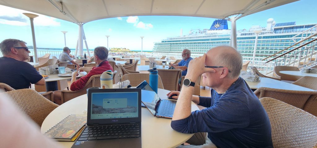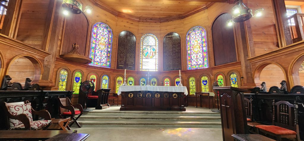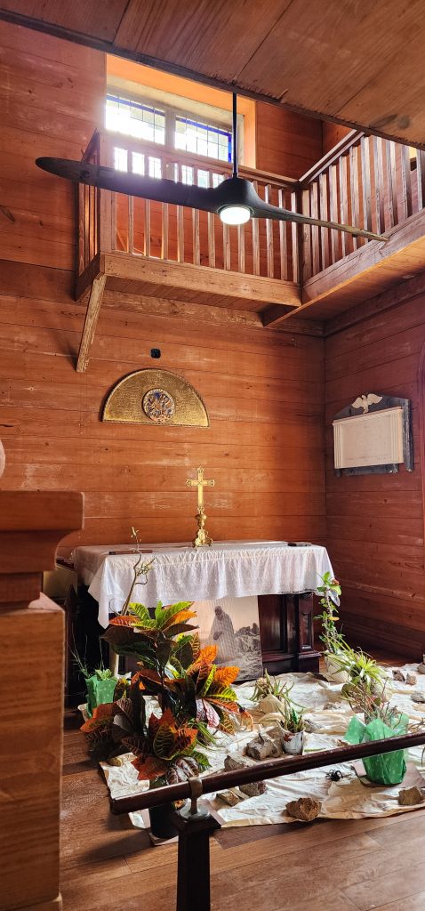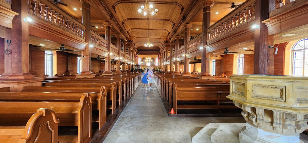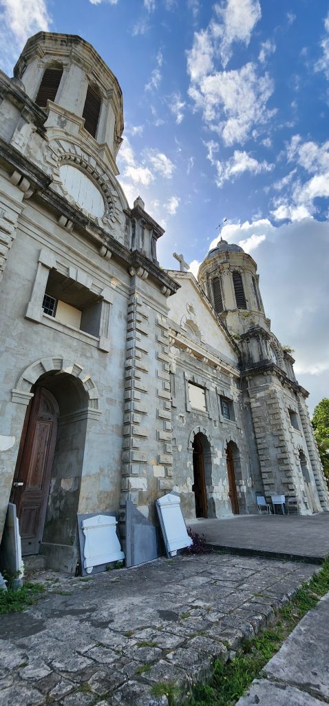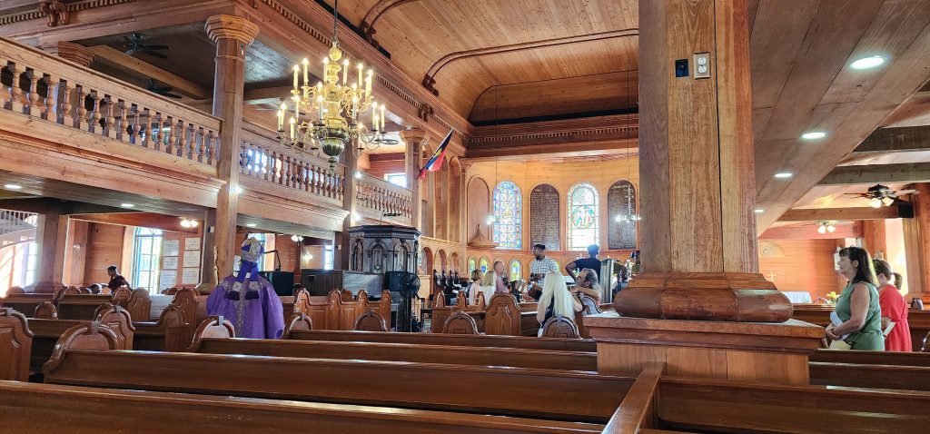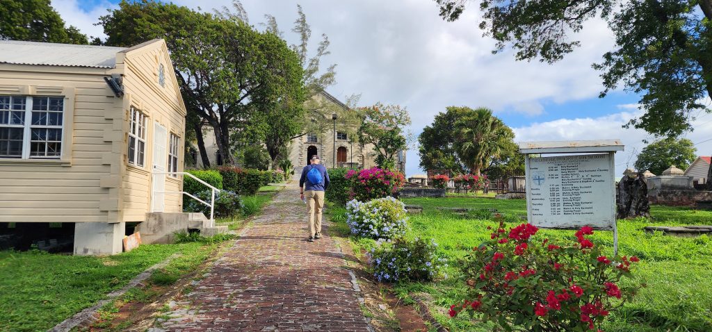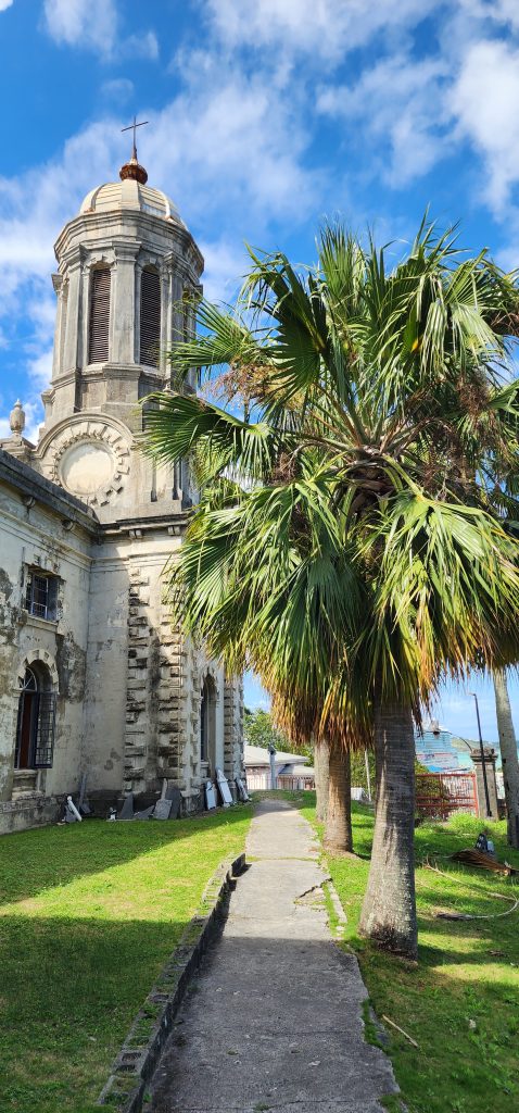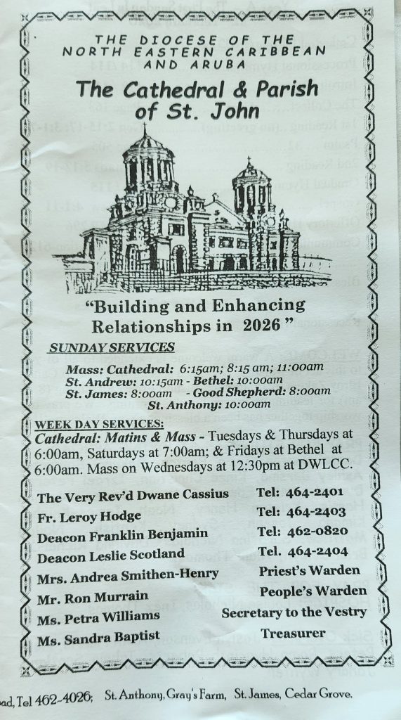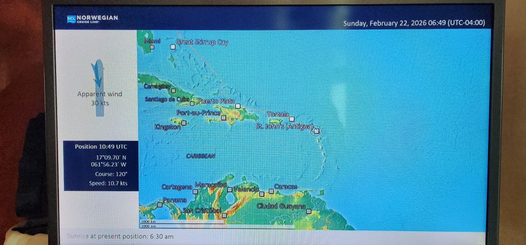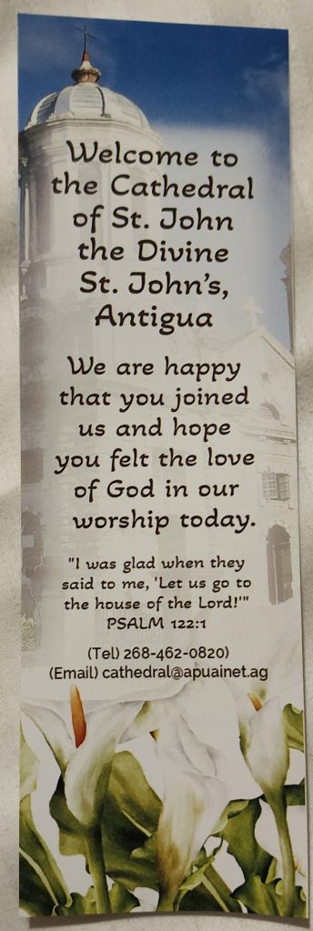 St. John’s, Antigua – Caribbean Cruise 2026 February 22, 2026February 22, 2026Sunday, February 22, 2026This morning, we were ready to leave the ship as soon as we were allowed. For the third port, the gangway closest to the ship’s Medical Center was closed for disembarkation and we saw an ambulance. I’ve seen gurneys taken aboard on two of the ports. Not sure what is happening. There aren’t as many people coughing on this ship as at the end of our transatlantic cruise in December. Lord, have mercy.We got off at 8:15 and high-tailed it uphill towards the Anglican Cathedral. We saw it from the ship so we knew the general direction. Their service began at 8:15 and we arrived around 8:30. The building is in the shape of a cross and we entered by the southern (shorter) chancel door. We made our way towards the center so that we could somewhat see the front altar. There was a barrier dividing the pew, so we couldn’t scoot over any closer to the nave.The windows were open, the fans were on, there was a lovely breeze, the people were friendly and welcoming, the music was beautiful, the Bishop’s sermon was sprinkled with choruses the congregation joined him singing while he encouraged listeners to overcome tribulations (the Gospel reading was Jesus in the wilderness), and we felt joy and honor to join them in worship. They asked visitors to stand and be recognized if they wanted. We didn’t really want recognition, but we knew we already stood out as visitors as we were two of a handful of white faces. We were given nice bookmarks as a welcome gift.Wait! Did I say the worship team included a man playing a steel pan drum?! It is the Caribbean instrument made from a steel oil drum, played with mallets. It makes various sounds so you can actually play a tune with it. Like a homemade xylophone with a light and festive sound. It was so lovely! There was also a keyboardist who was amazing and a “traditional” drum set like we see at home.There was a choir, all dressed in white clothes. And at the end, a children’s choir led a song. We could hear their sweet voices but I didn’t see them.I could have sat in that Cathedral all day. It was such a contented feeling.The building architecture was interesting. The outside of the building looks in severe disrepair. Having been rebuilt after an earthquake, the inside is all pine wood with a pitched roof to help it withstand future hurricanes and earthquakes. They say it is a building within a building. Sadly, their graveyard and many grave stones are broken and misplaced – likely due to those catastrophic events.There is an original chandelier at the intersection of the nave and chancel. A woman told us that there is a reproduction in Kent, England. There is also a fan made from an airplane propeller. It came from the plane a local man was flying during World War I. He was the only island citizen who died in that war.The Market and 99% of the stores and restaurants were closed today since it is Sunday. I bet it is a fun and hopping place during the week. We were asked by several taxi drivers if we wanted a ride/tour. They were polite and accepted our “no thank yous.”After wandering around town, we finally made our way back to the ship and finished our self-imposed four mile walking quota on Deck 7. It was shady, breezy, mostly empty, and had a nice view. I began listening to a novel and Gregg listened to a podcast. 2026 Caribbean Cruise from Jacksonville Travels CaribbeanChurchesTravels